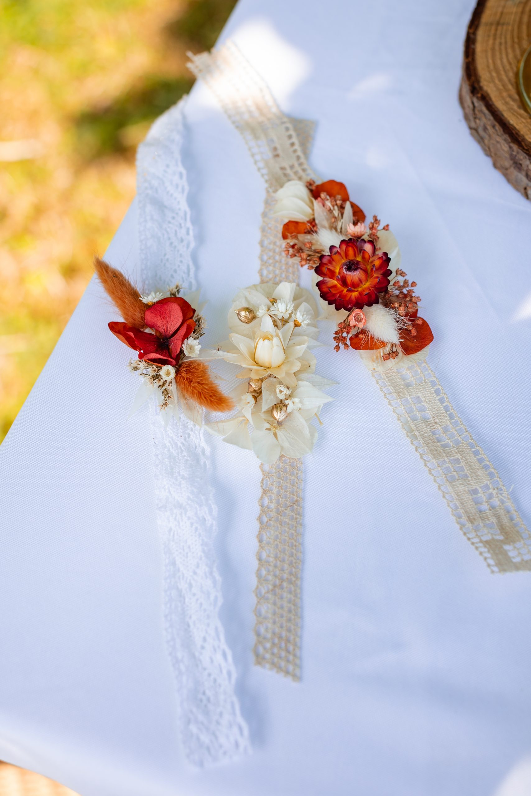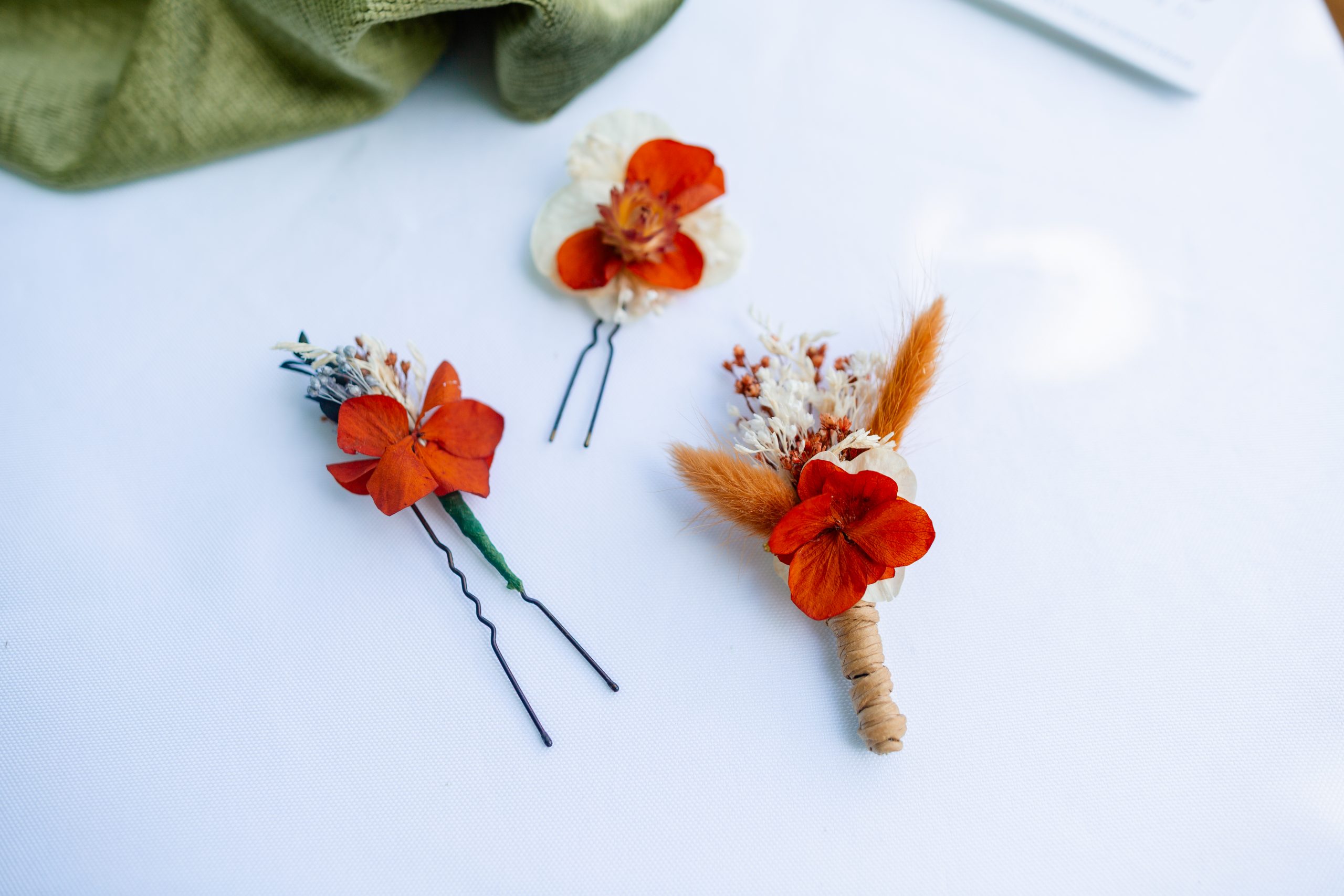 Accessoires de cérémonies fleuries faits main : couronnes de tête, boutonnières, bracelets et accessoires cheveux pour mariages, EVJF et événements festifs.